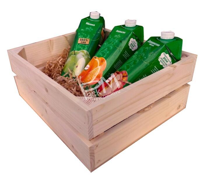 Ящик реечный без крышки (артикул 0345) может быть укомплектован под заказ декоративной стружкой или бумагой. В готовом изделии также устанавливают внутренние ложементы при необходимости стабилизации сувениров.