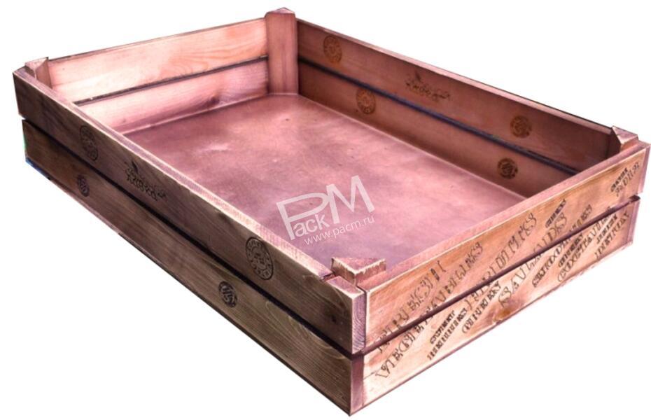 Ящик реечный для фруктов и овощей без крышки изготавливается из сухой струганной рейки и бруска. Представленные в каталоге изделия могут быть как с крышкой, так и без нее. При производстве реечного ящика (артикул 0343) по желанию клиента могут использоваться следующие элементы декора: джутовые ручки, металлические петли и защелки. На готовое изделие возможно нанесение графического изображения или логотипа, как на саму рейку, так и на дополнительные декоративные площадки, выполненные из фанеры и прикрепленные к ящику.