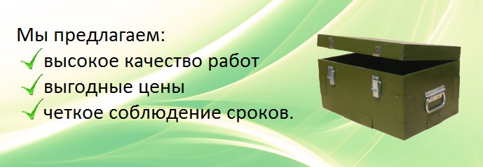 ООО «ПАК-М» занимается изготовлением военных ящиков любых размеров. Они производятся в полном соответствии со стандартами ГОСТ. Возможно изготовление по чертежам заказчика. Мы предлагаем высокое качество работ, выгодные цены, а также четкое соблюдение сроков.